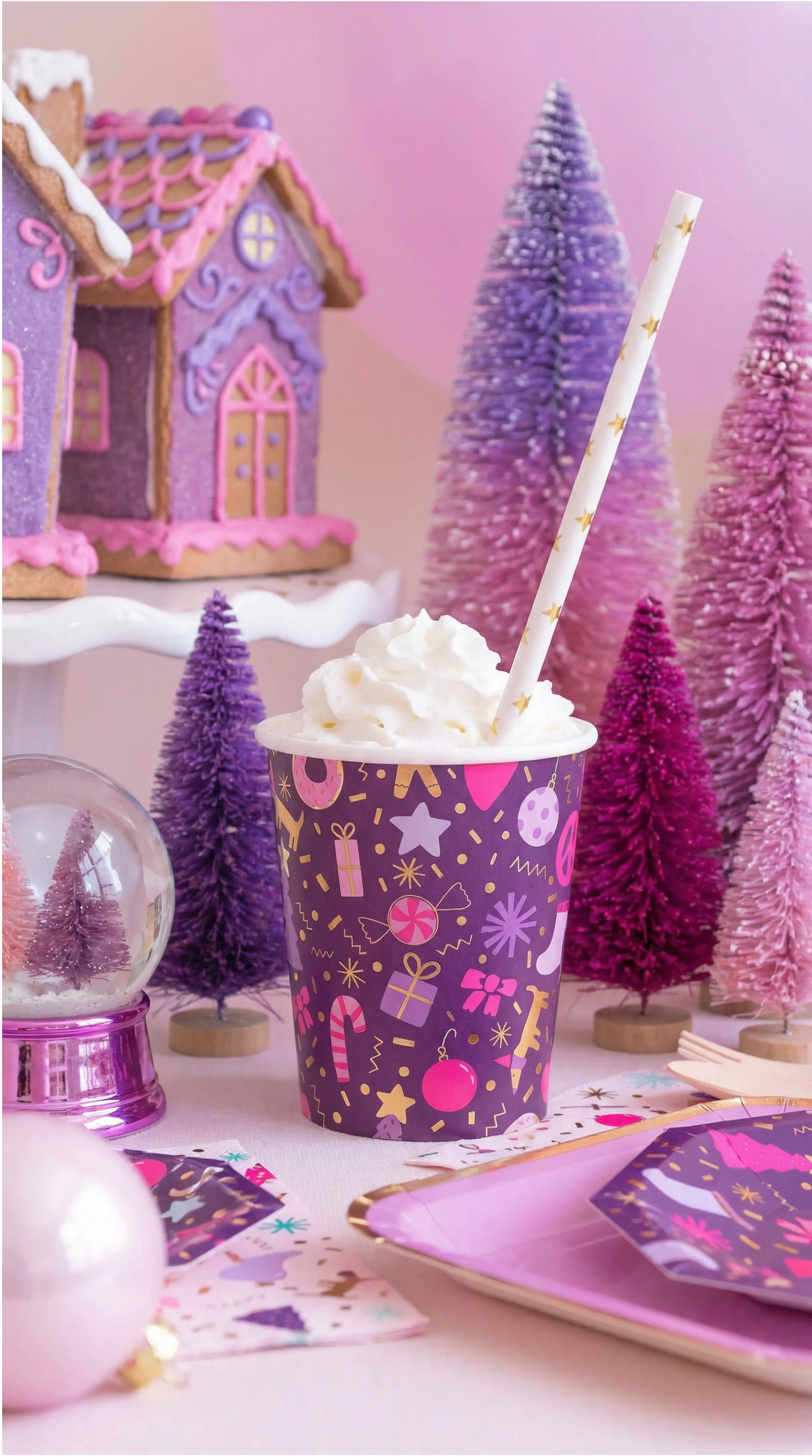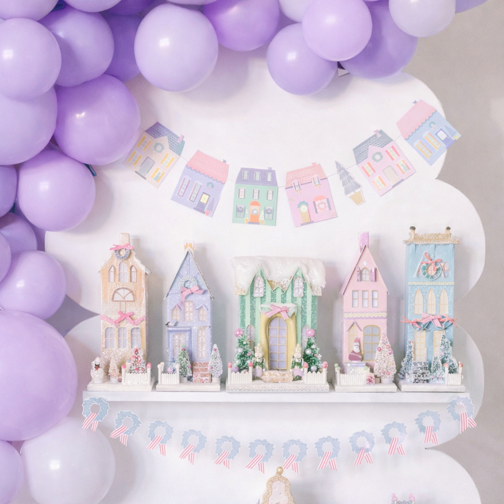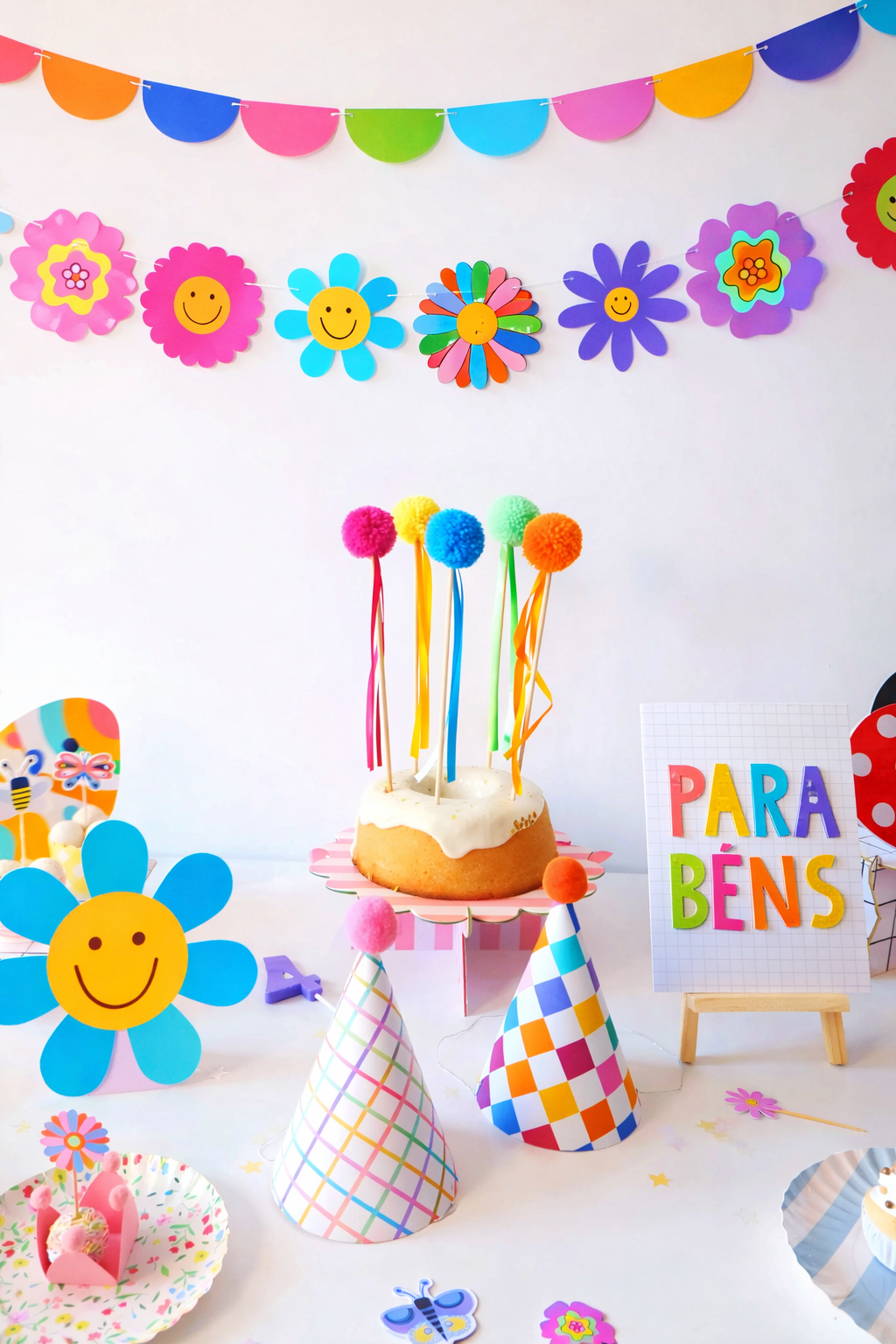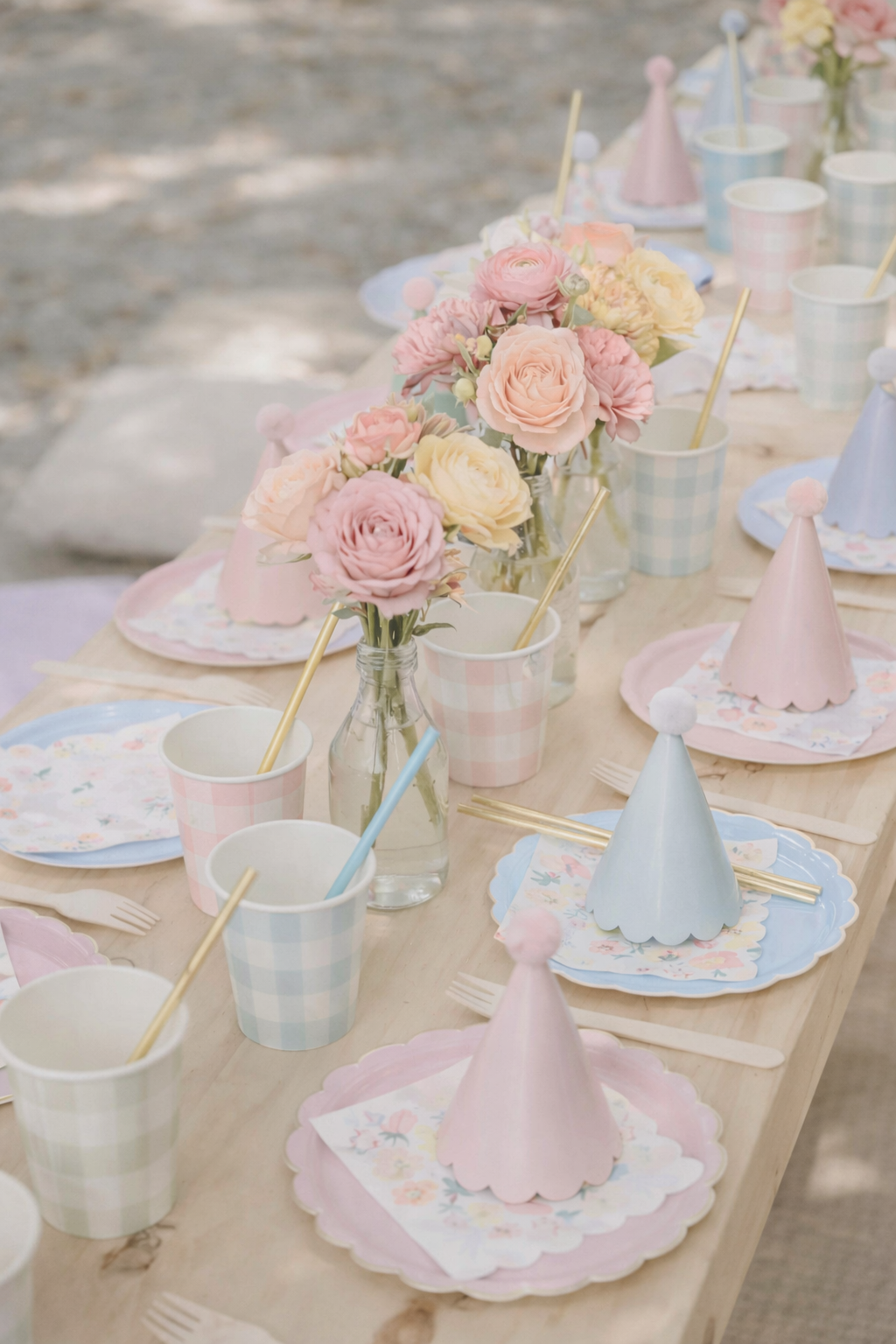 A vibrant party setup featuring playful pastel tones and whimsical details. This table is styled with colorful plates, matching cups, and festive confetti, creating a cheerful celebration mood. The candy-striped lollipop and fun party blower add a touch of sweetness and charm, making it perfect for birthdays or any joyful occasion.