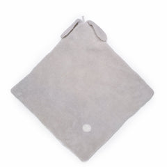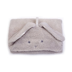 The Glad Dreams Hooded Baby Blanket is a soft, snuggly companion designed for comfort, play, and cozy warmth. Made from plush glacier grey fur, the hood features extra-long white satin-lined bunny ears, an embroidered bunny face, and a fuzzy white tail on the back for delightful woodland charm.