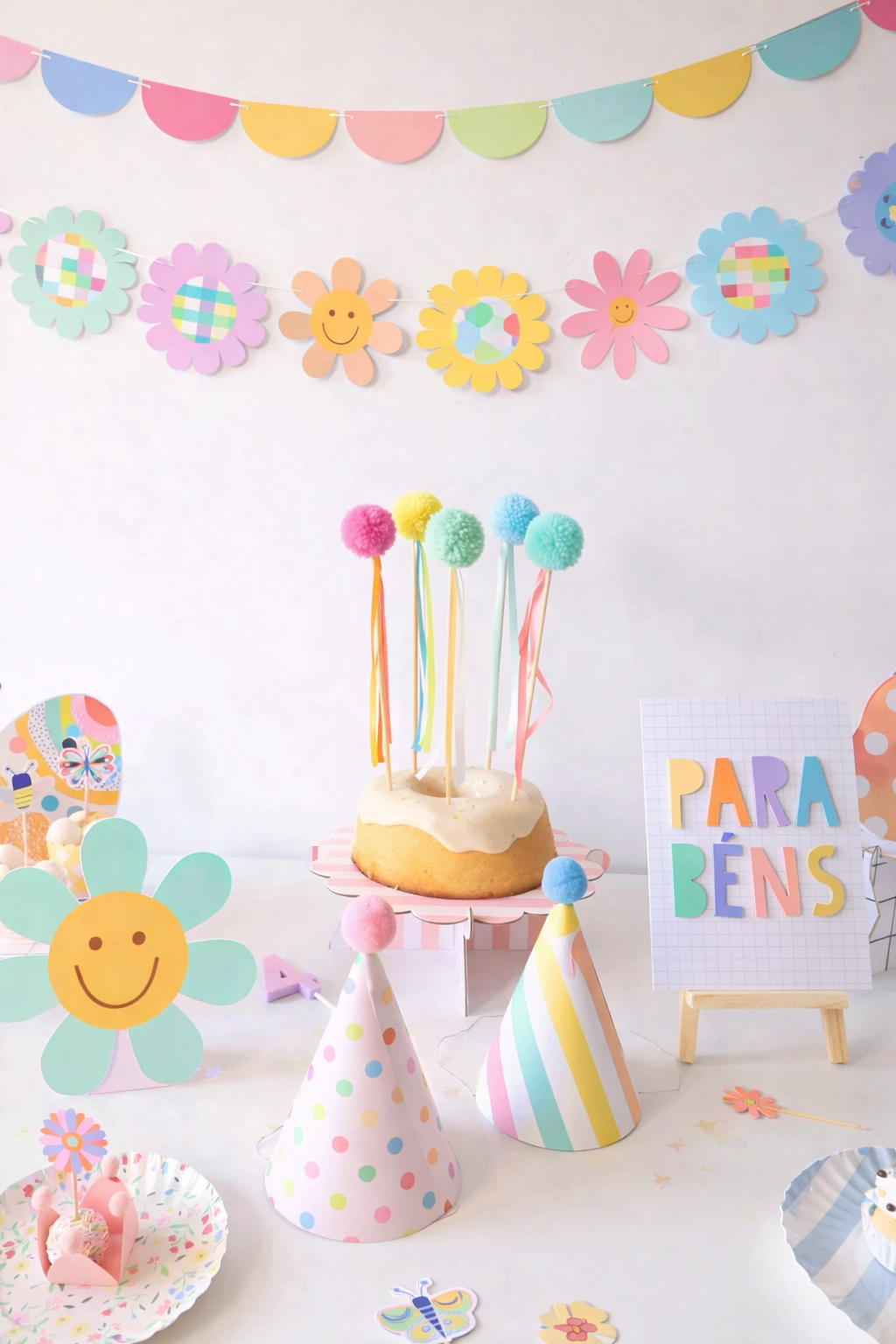A vibrant party setup featuring playful pastel tones and whimsical details. This table is styled with colorful plates, matching cups, and festive confetti, creating a cheerful celebration mood. The candy-striped lollipop and fun party blower add a touch of sweetness and charm, making it perfect for birthdays or any joyful occasion.